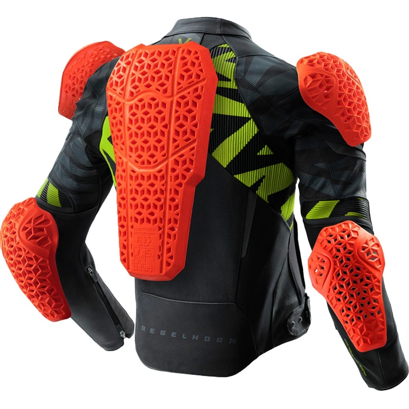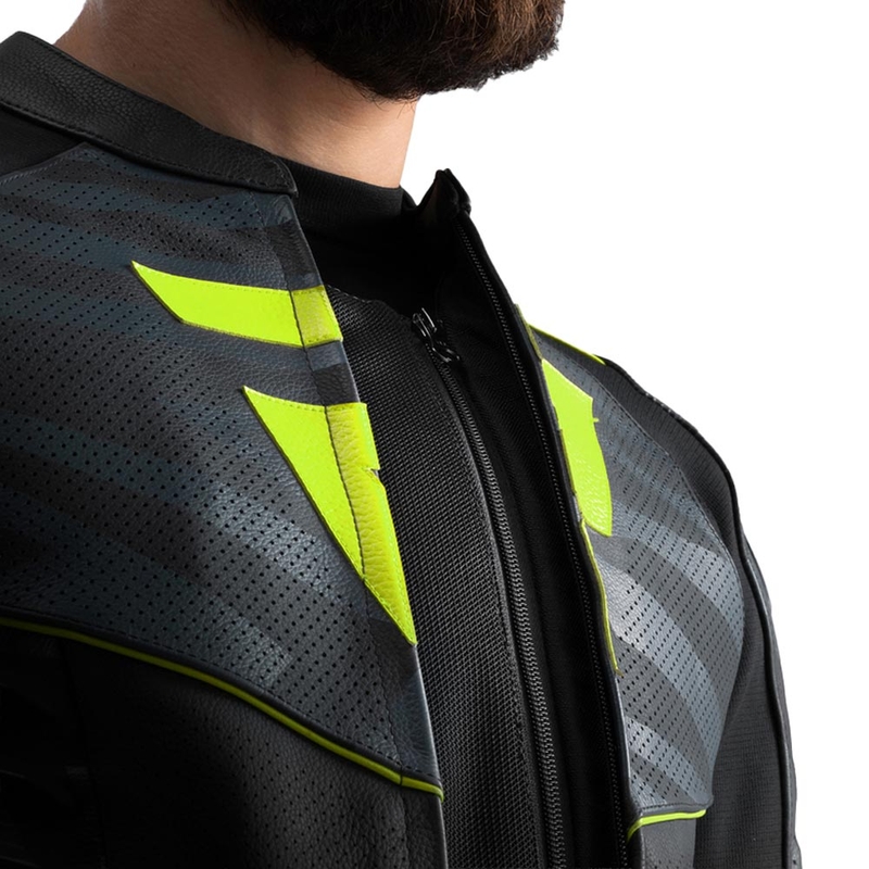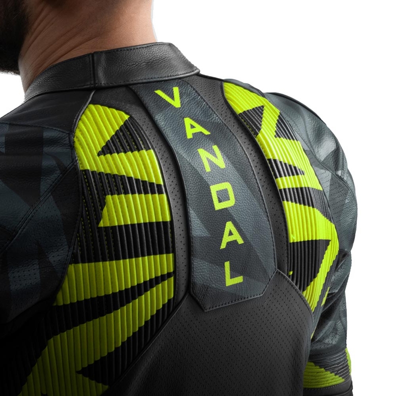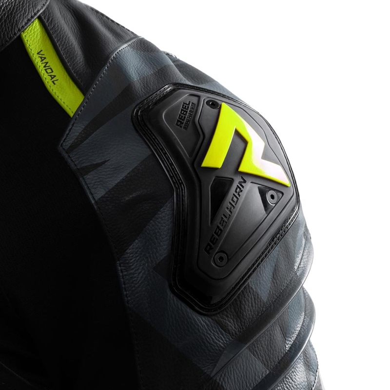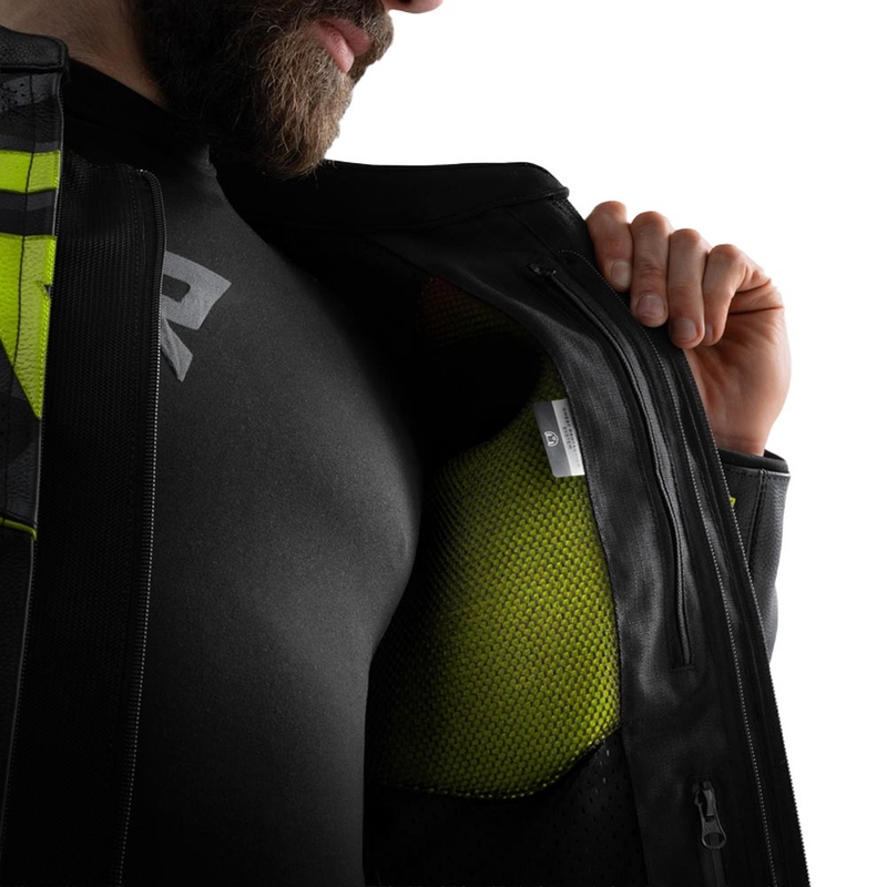 Kožená motorkárska bunda je vybavená kompletnou sadou chráničov úrovne 2 na ramenách, lakťoch a chrbte.
